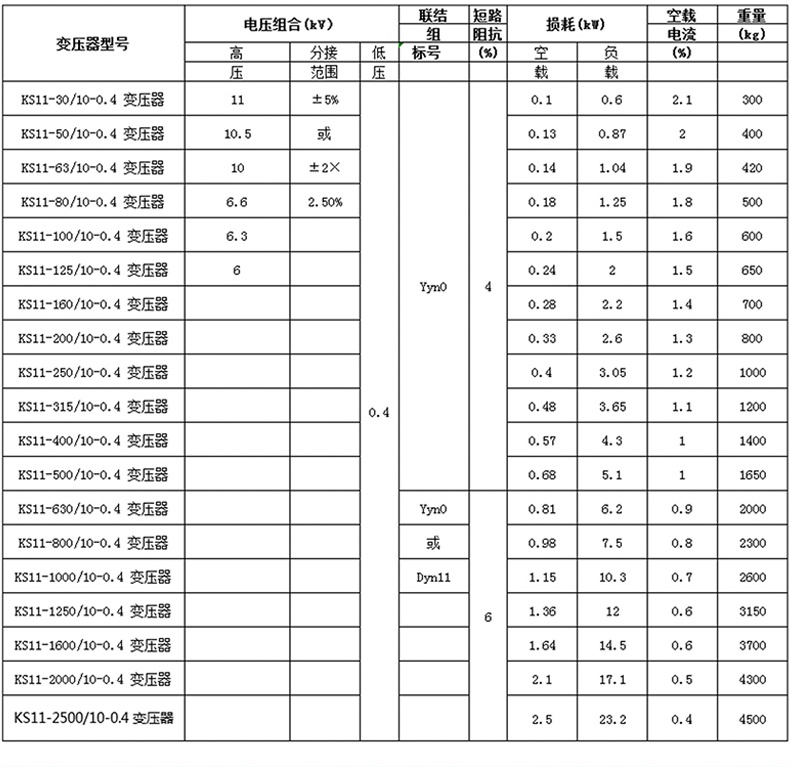 KS11系列10KV礦用變壓器KS11系列礦用變壓器,作為礦并的配電設備.該產品具有體積小,易下并,結構合理、損耗低.教熱性能好等特點。本系列產品采用優質的晶粒取向優質高導磁性能硅鋼片疊裝而成,鐵芯為芯式鐵芯,全斜接縫迭積式鐵芯,其鐵芯柱為多級圓截面,確保低噪音低損耗油箱結構堅固,箱壁兩側焊有高、低壓電纜接線盒,作為電纜接線之用,高壓線圈須有額定電壓士5